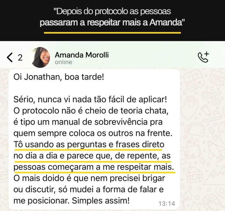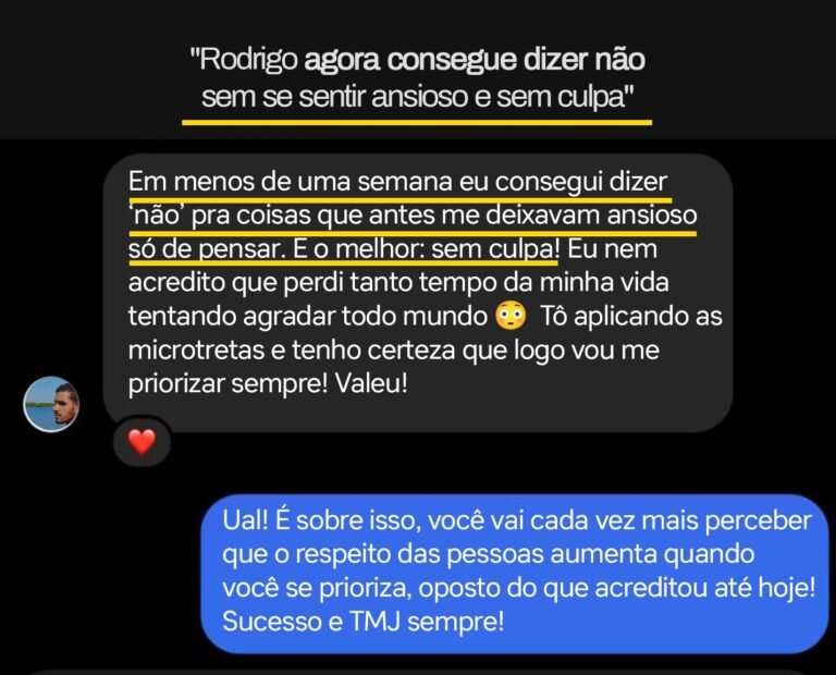 Foi só quando entendi os padrões ocultos por trás da dependência emocional e da dificuldade de impor limites que consegui mudar esse jogo. Apliquei um método que transformou minha forma de me relacionar, trouxe respeito, equilíbrio e me fez ter controle sobre minhas escolhas sem culpa ou medo.